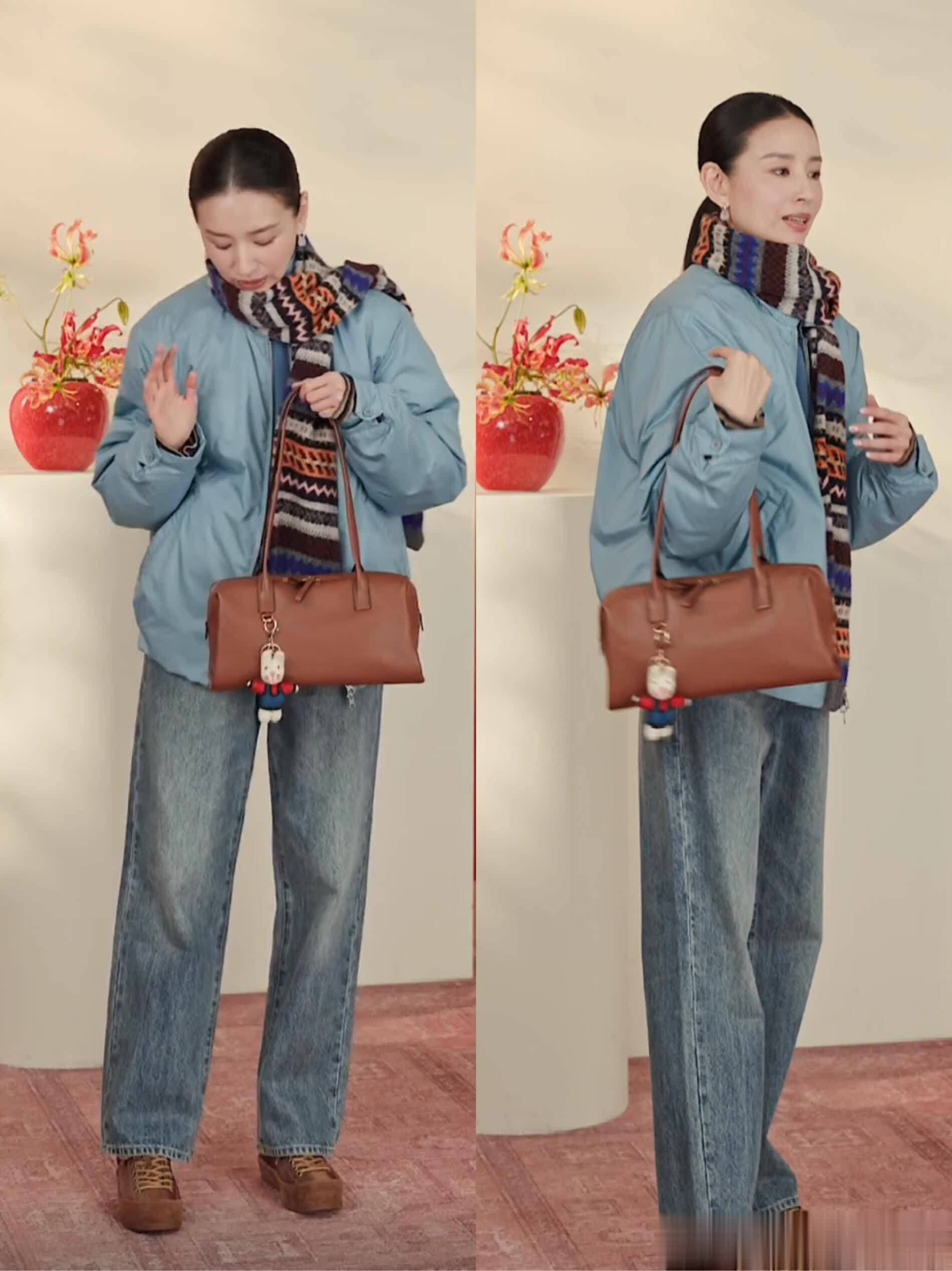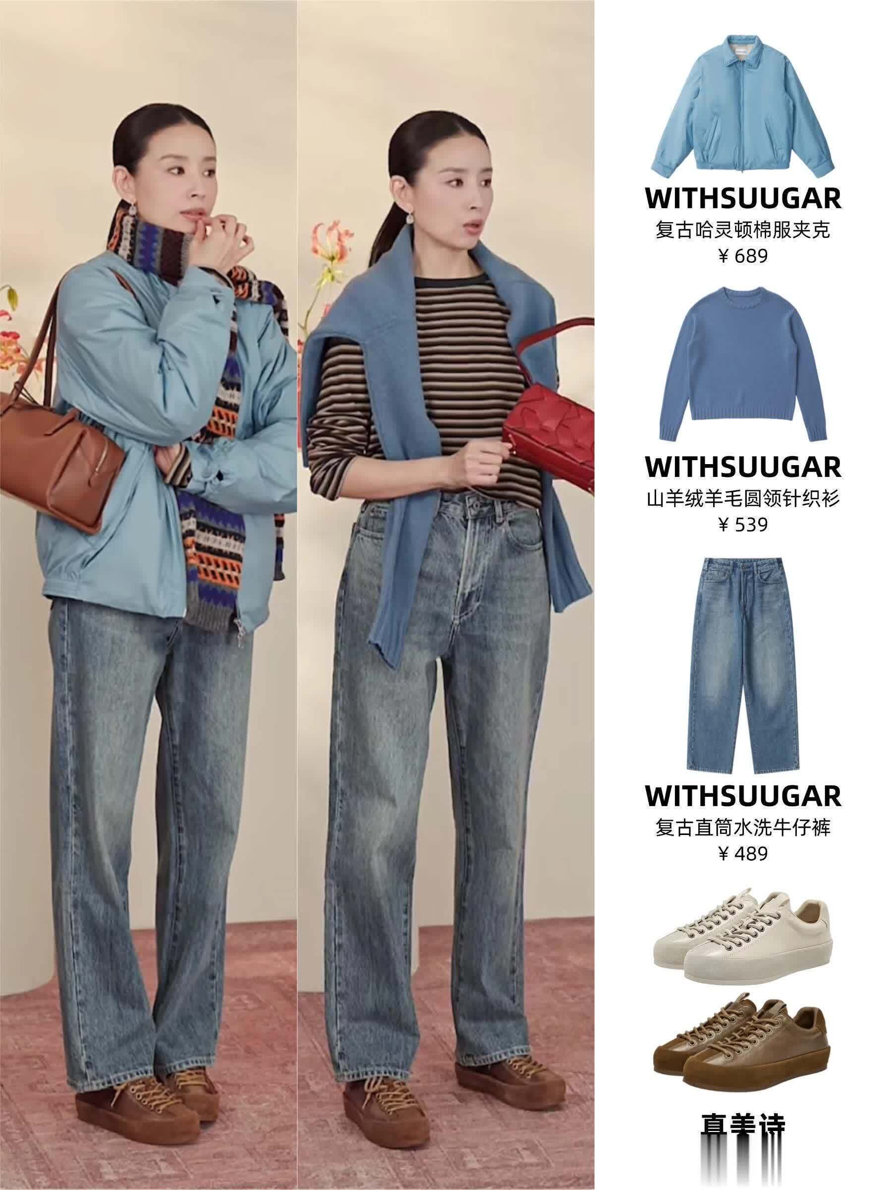 这套 look 将复古蓝色夹克、条纹针织衫与水洗蓝牛仔裤组合,搭配厚底德训鞋,是休闲与复古的完美融合。它打破了传统通勤装的严肃,注入了恰到好处的松弛感。正如笔记所说,这种搭配不刻意追求潮流,而是通过质感和剪裁营造时髦氛围。不过,就像评论区有朋友提到的,这种宽松的牛仔裤和夹克对身材有一定要求,更适合高挑纤细的身形。